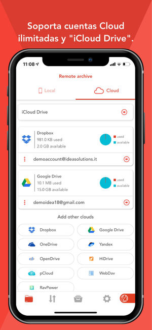 – Integración con los servicios de Dropbox, GDrive, OneDrive, iCloud para el almacenamiento remoto de archivos.